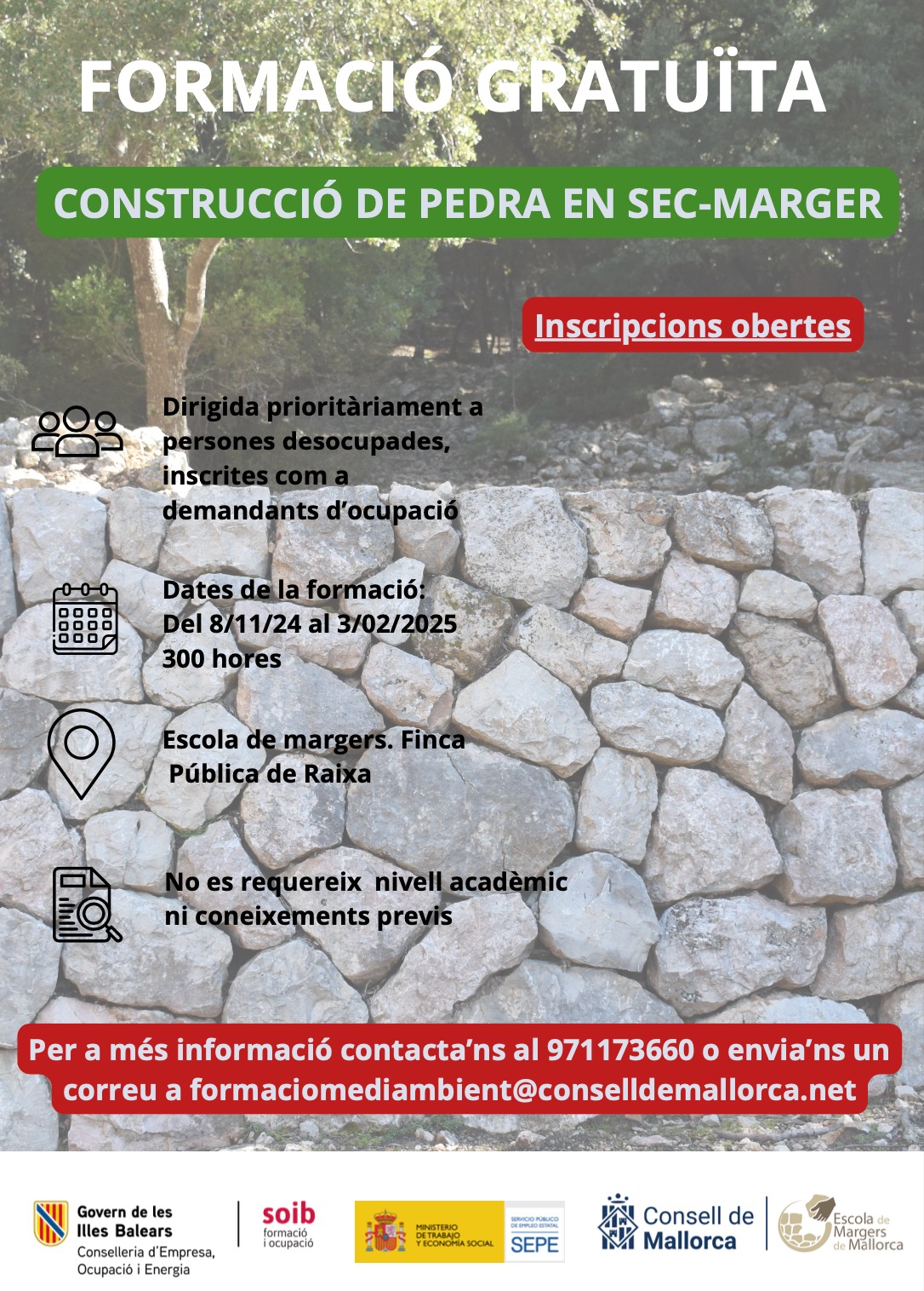 El Departament de Medi Ambient, Medi Rural i Esports del Consell de Mallorca gestionarà un curs nou gratuït en el Centre de Formació Escola de Margers, situada a la finca pública de Raixa, en el municipi de Bunyola.