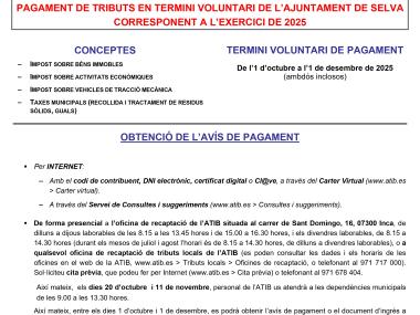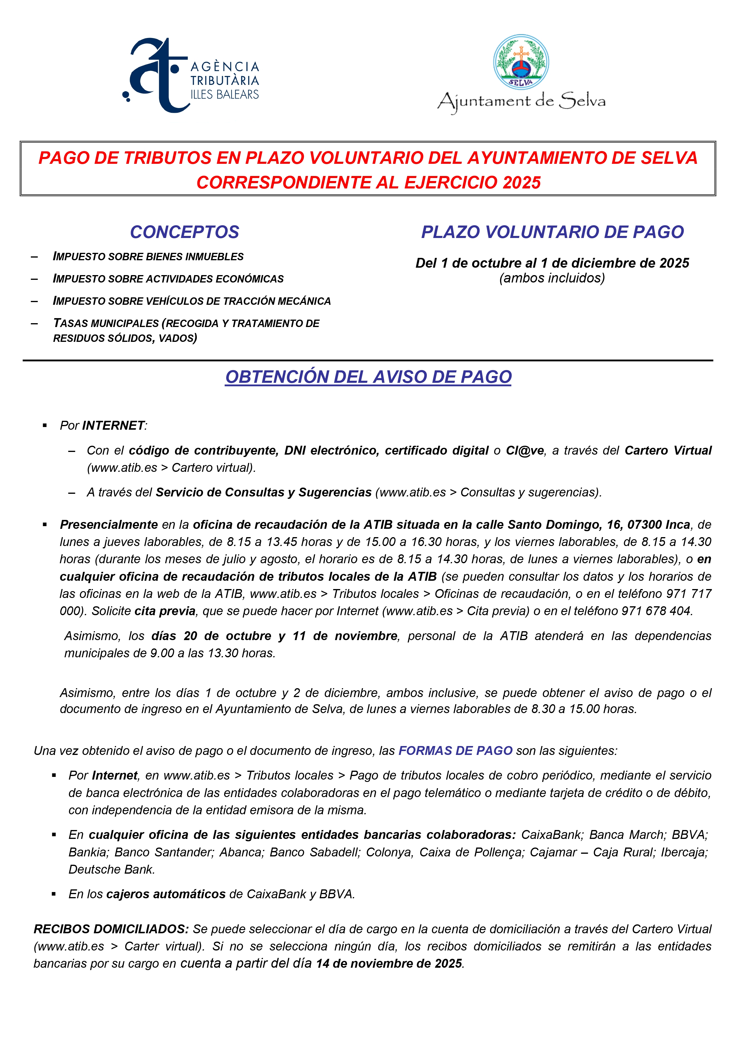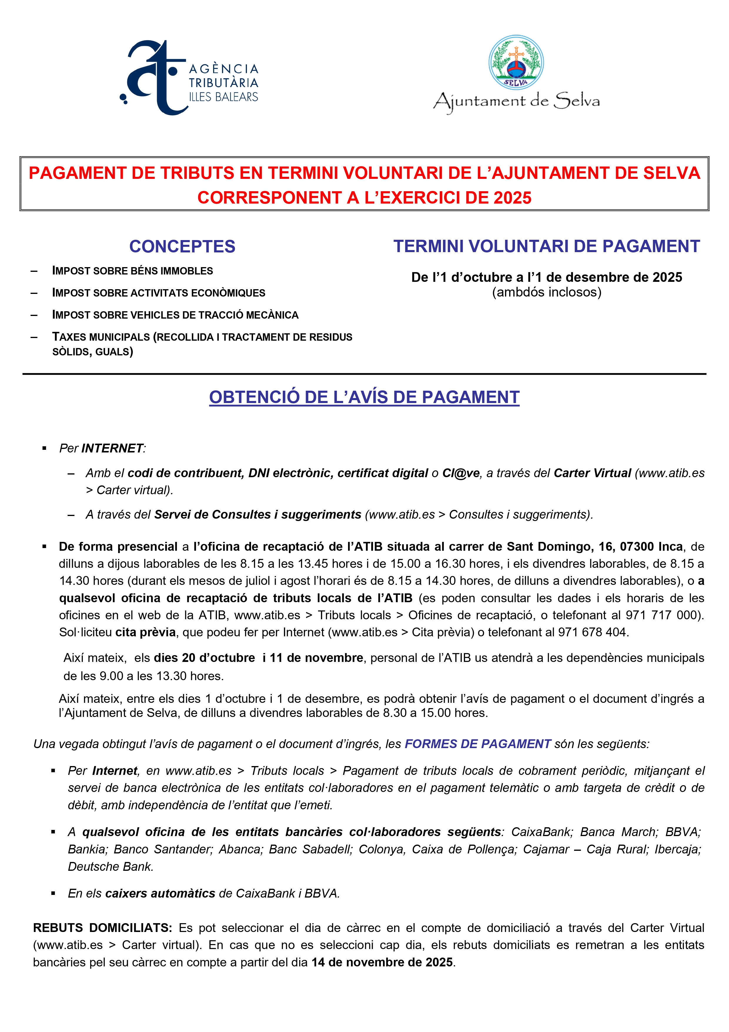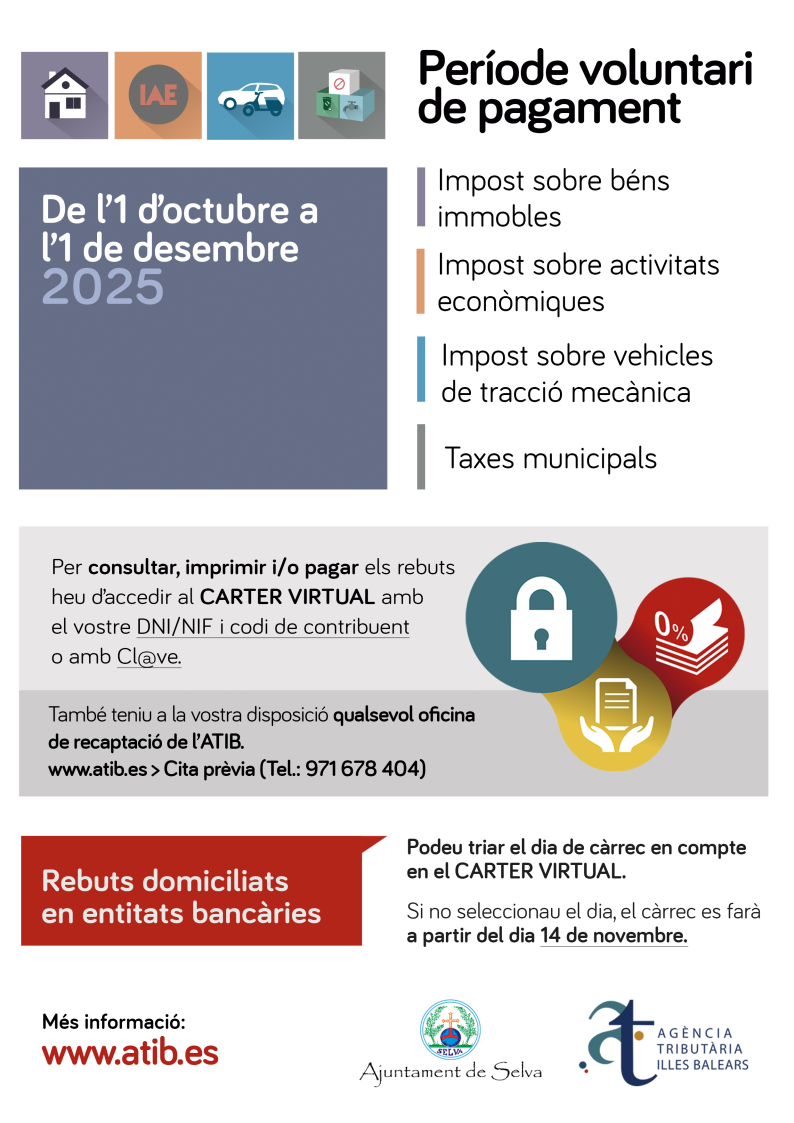 ATIB: Atenció al contribuent per consultes i tràmits el dia 20/10/2025 amb cita prèvia al telèfon 971 51 50 06 o través de la Seu Electrònica des del següent enllaç: selva.sedelectronica.es/citaprevia