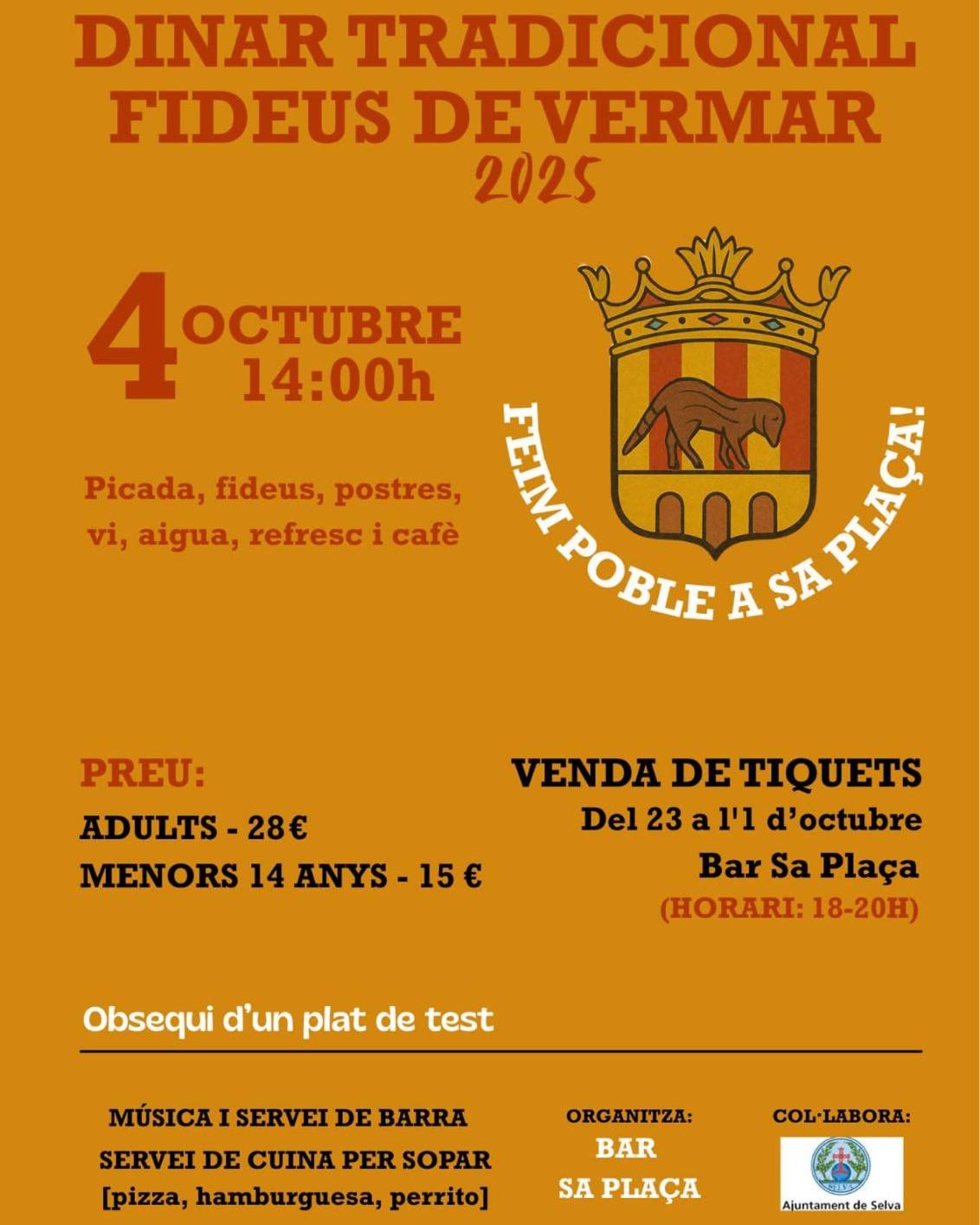 Picada, fideus, postres, vi, aigua, refresc i cafè