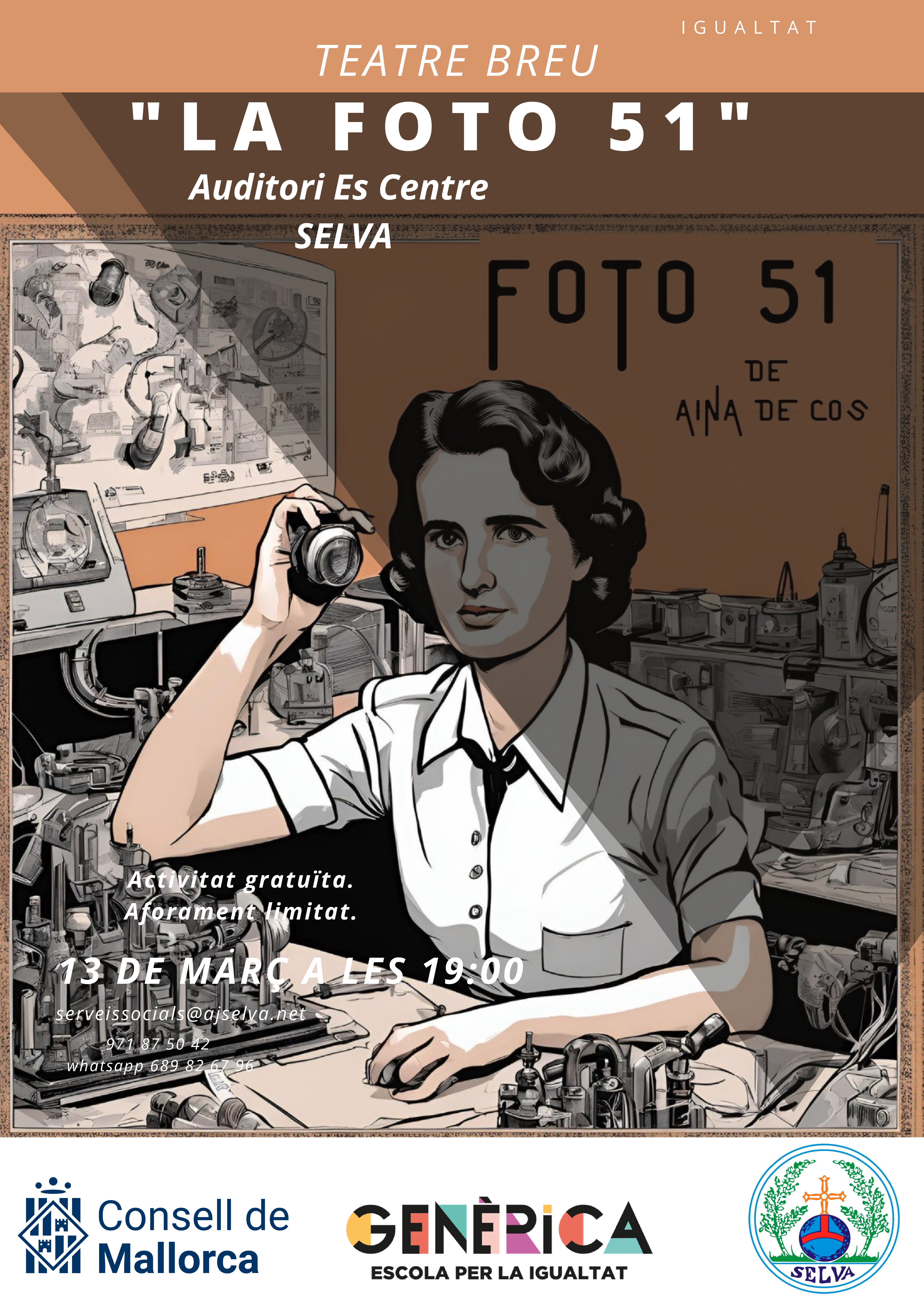 El proper divendres dia 13 de març a l'auditori a Es Centre de Selva a les 19:00 Obra de teatre LA FOTO 51 a càrrec de El Somni Produccions
