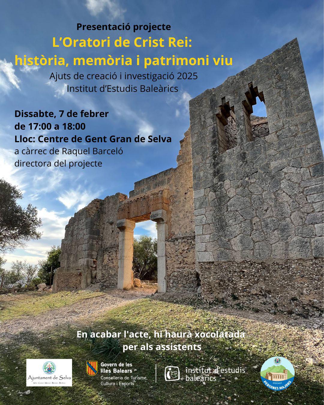 El proper dissabte 7 de febrer, Raquel Barceló, directora del projecte, presentarà "L'Oratori de Crist Rei: història, memòria i patrimoni viu", una iniciativa que ha estat seleccionada per l'Institut d'Estudis Baleàrics dins la seva línia d'ajuts a la recerca i amb el suport de l'Ajuntament de Selva.