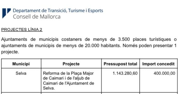 L'Ajuntament ha aconseguit la subvenció de 400.000 euros del Consorci Borsa d'Allotjaments Turístics que gestiona el Consell de Mallorca i que completa el finançament del Projecte de Reforma de la Plaça Major de Caimari i l'Aljub, un projecte que contempla conservar l'estructura arquitectònica de Sa Plaça. Està prevista la signatura del Conveni entre l'Ajuntament i el Consorci abans de març. Mentrestant, es redactarà i s'exposarà públicament el projecte per espai d'un mes. L'Ajuntament preveu que les obres es podran iniciar una vegada passat l'estiu i celebrada la Fira de s'Oliva d'enguany.
